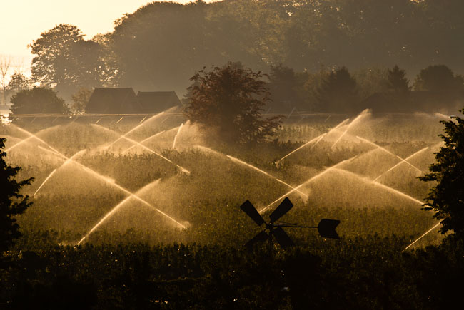Zondagochtend, in slaap gevallen maar toch net op tijd op om in de verte mooie mistbanken te zien. Rijdend richting Schalkwijk werd het steeds mooier en plotseling werd mijn aandacht afgeleid van de mist door sproeiers die een boomgaard besproeiden. De enige parkeerplek was een bushalte dus maar duimen dat het vroeg genoeg was en de bussen nog niet op gang waren gekomen. En dat was de moeite waard. Het water vormde het prachtige lijnenspel dat je hieronder ziet.